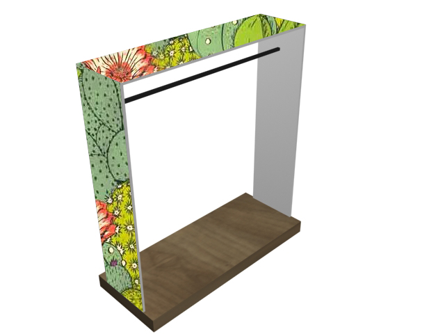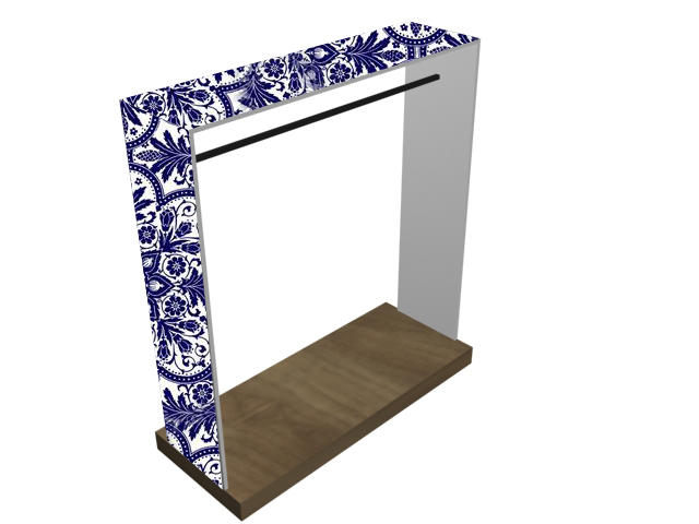 Arara com exposição lateral e uma moldura em mdf laminado em diversos materiais e tubo cromado ou epoxi.
