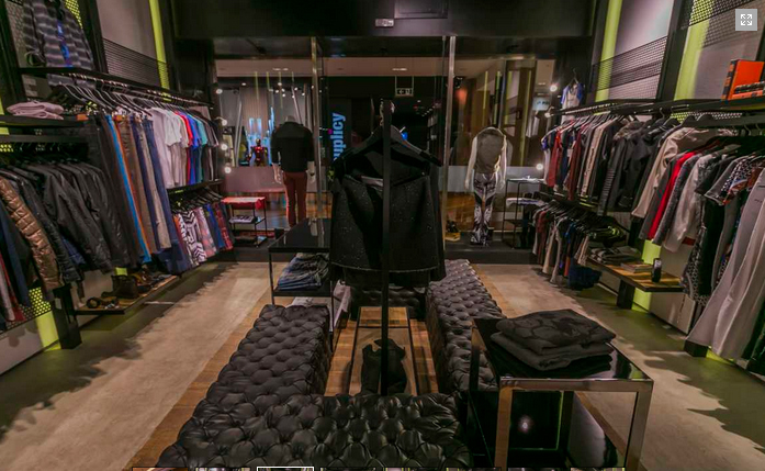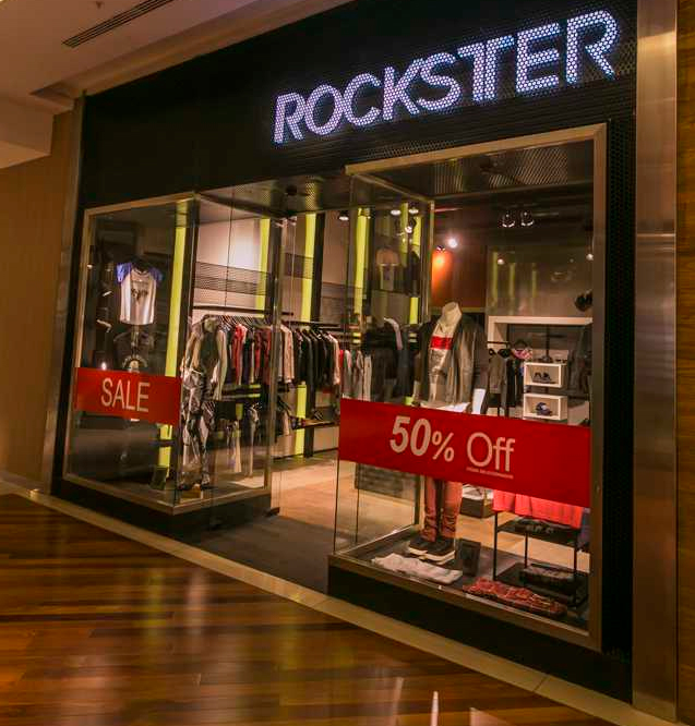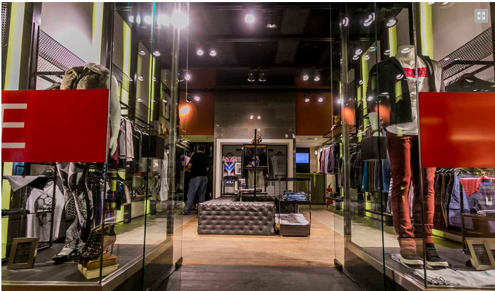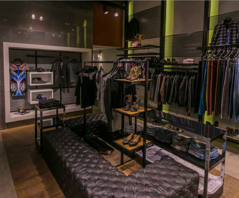 Loja jovem com visual urbano. Iluminação focada nos produtos. Chapas envernizadas dão o tom quase industrial.